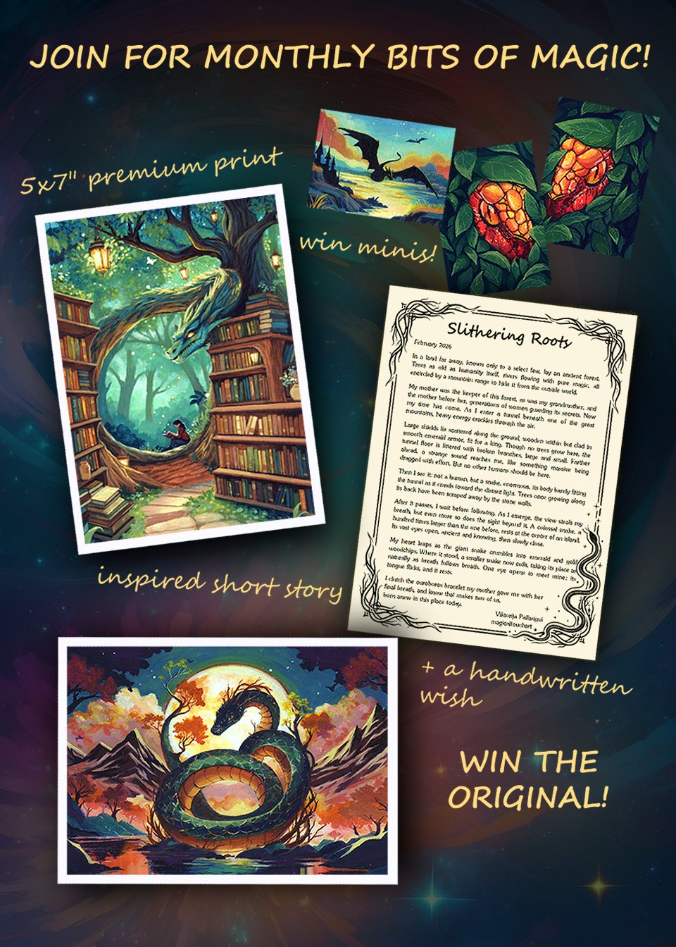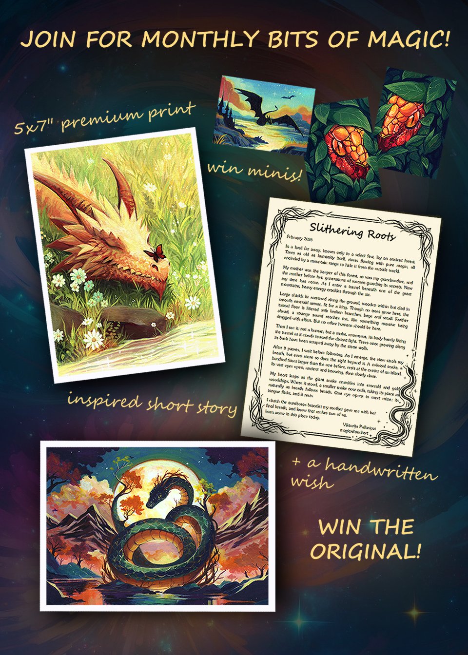 Receive a new magical creature every month – exclusive 5×7″ prints, stories, and chances to win original art!