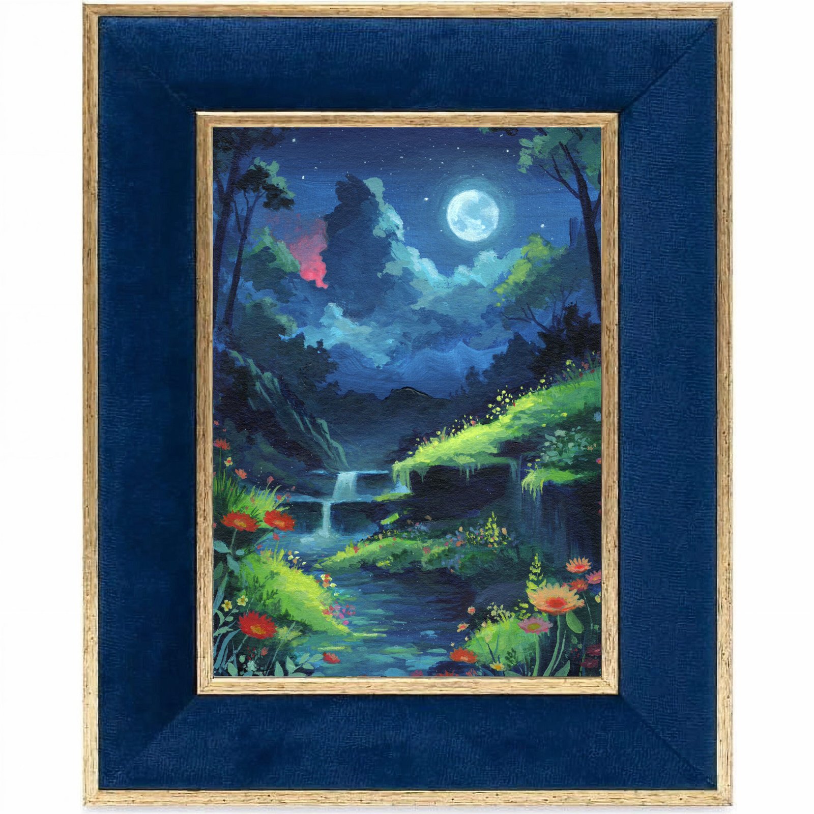 A secret waterfall parts the midnight forest, inviting you to step inside the hush of living starlight.
